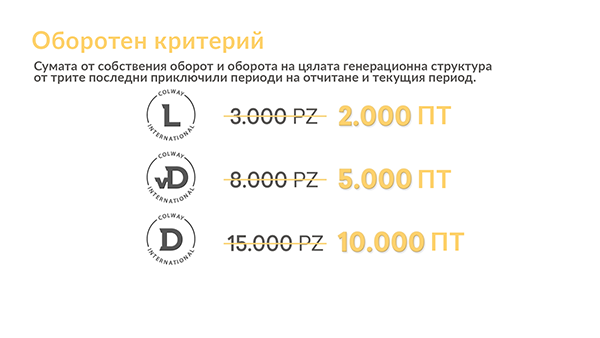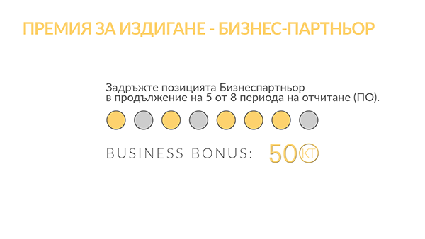 Аналогично е решението за останалите премии за издигане. Премахнахме оборотния критерий, за да може новият Партньор по-бързо да получи своята първа премия. Достатъчно е да се издигне до позиция Бизнес партньор и да я задържи в продължение на 5 от 8 последователни Периоди на отчитане, за да получи 50 КТ направо във виртуалния портфейл.
