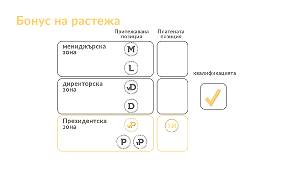 Въвеждаме разделение на три зони: мениджърска, директорска и президентска. Ако някога в своята история на съвместна работа с Colway International Партньорът е бил на позиция пр. ВП – за да получи квалификация за Бонус на растежа – трябва да се намира в президентската зона. Падането в директорската зона, напр. на позиция Директор, означава, че Партньорът няма да получи квалификацията. След връщане в президентската зона получава квалификацията. Аналогично изглеждат нещата и по отношение на останалите зони.