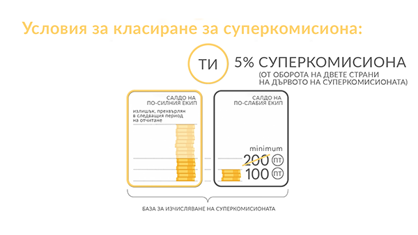 Първата добра новина – намаляваме квалификацията за супер комисионна от 200 ПТ на 100 ПТ. Благодарение на това новите Бизнес партньори по-бързо ще се радват на два източника на комисионни.